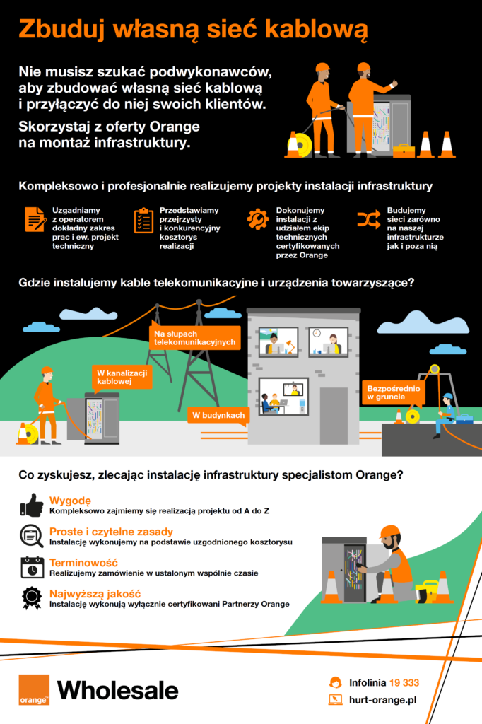 Skorzystaj z oferty Orange na montaż infrastruktury. To wygodne rozwiązanie, by stworzyć i rozwijać własną sieć kablową, bez konieczności poszukiwania podwykonawców. W ramach usługi zainstalujemy okablowanie w dowolnej infrastrukturze: w kanalizacji kablowej, na słupach telekomunikacyjnych, bezpośrednio w ziemi i w budynkach.