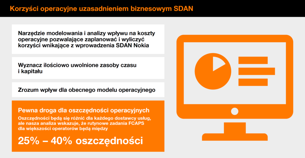 Dla urządzeń OLT istotna jest możliwość współdzielenia jednego takiego systemu przez kilku operatorów jednocześnie przy zachowaniu całkowitej niezależności i izolacji. Tak jakby wszyscy posiadali fizycznie swoje dedykowane urządzenie. Nokia pomaga operatorom już dzisiaj uzyskiwać korzyści operacyjne nawet samodzielnie, dzięki automatyzacji procesów operacyjnych, delegowaniu zadań oraz upraszczaniu wprowadzania i aktywacji nowych usług. Tak przygotowane narzędzie SDAN przyniesie dodatkowe korzyści przy współdzieleniu.