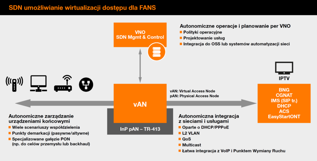 Pojawienie się sieci definiowanej programowo (SDN) i wirtualizacji funkcji sieciowych (NFV) w domenie dostępu stwarza nowy sposób współdzielenia infrastruktury. Jest to koncepcja stojąca za udostępnianiem sieci o stałym dostępie (FANS), techniką wykorzystującą wirtualizację jako sposób „dzielenia” sieci dostępowej i zapewniania niezależnej kontroli nad każdym segmentem. W tym modelu pojawiają się nowe możliwości dokładania hurtowych usług chmurowych w celu realizacji większej liczby aplikacji koniecznych do budowania dostępu optycznego FTTX. Pozwala to na zaoferowanie klientom lepszych usług, obniżenie kosztów dla operatorów i zwiększenie możliwości współinwestowania lub współdzielenia infrastruktury dostępu stacjonarnego nowej generacji.
